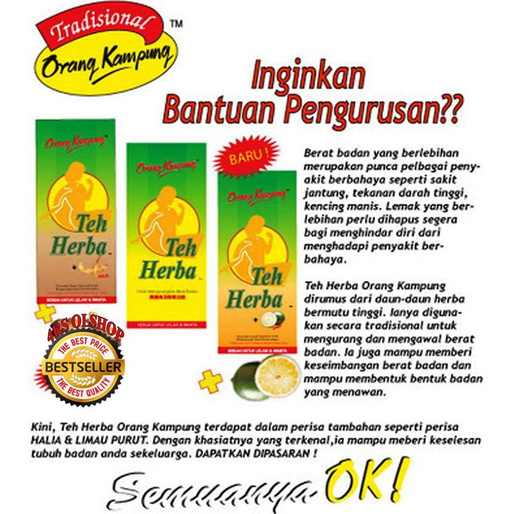 Herbal Tea specially formulated to reduce weight remove toxins in the body to overcome the problem of constipation stabilize blood sugar levels helping to eliminate body odor and helps the digestive system. ORANG KAMPUNG TEH HERBA HALIA. Teh Orang Kampung Original is formulated from traditional herbs that are used traditionally to help you control and reduce weight.